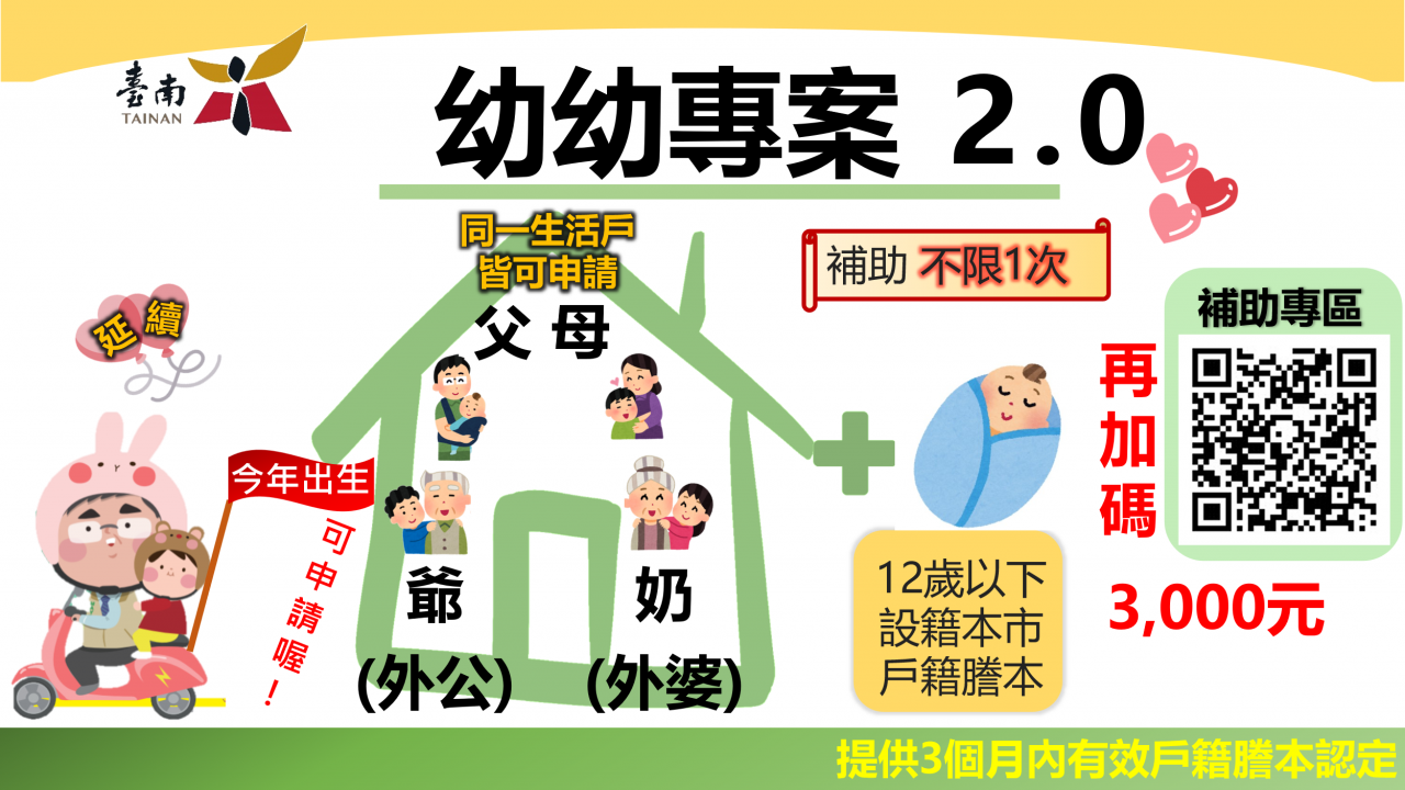 (一)「家中有 12 歲以下兒童之直系親屬」、「18~30 歲青年」、「物流/外送員專案」及「淹水災損受戶」換/新購電動機車再加碼 3,000 元!詳情請洽環保局 06-3354359 。
