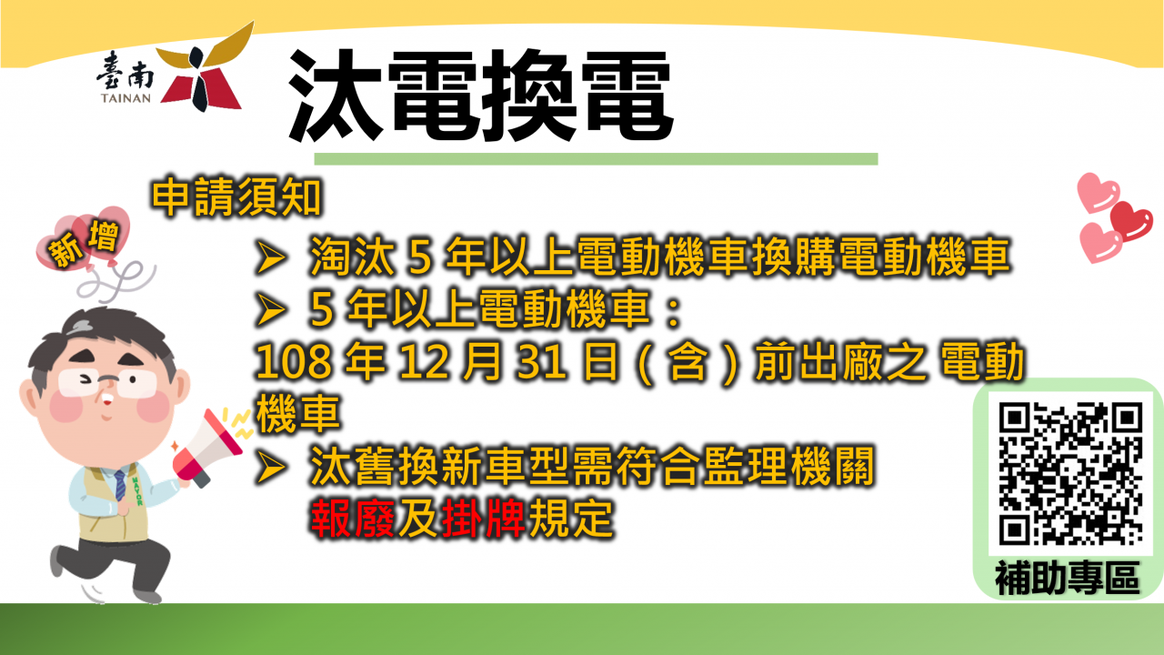 (四)114 年環保局推出淘汰五年以上電動機車換購電動機車,含加碼最高補助 13,500 元喔!詳情請洽環保局 06-3354359 。