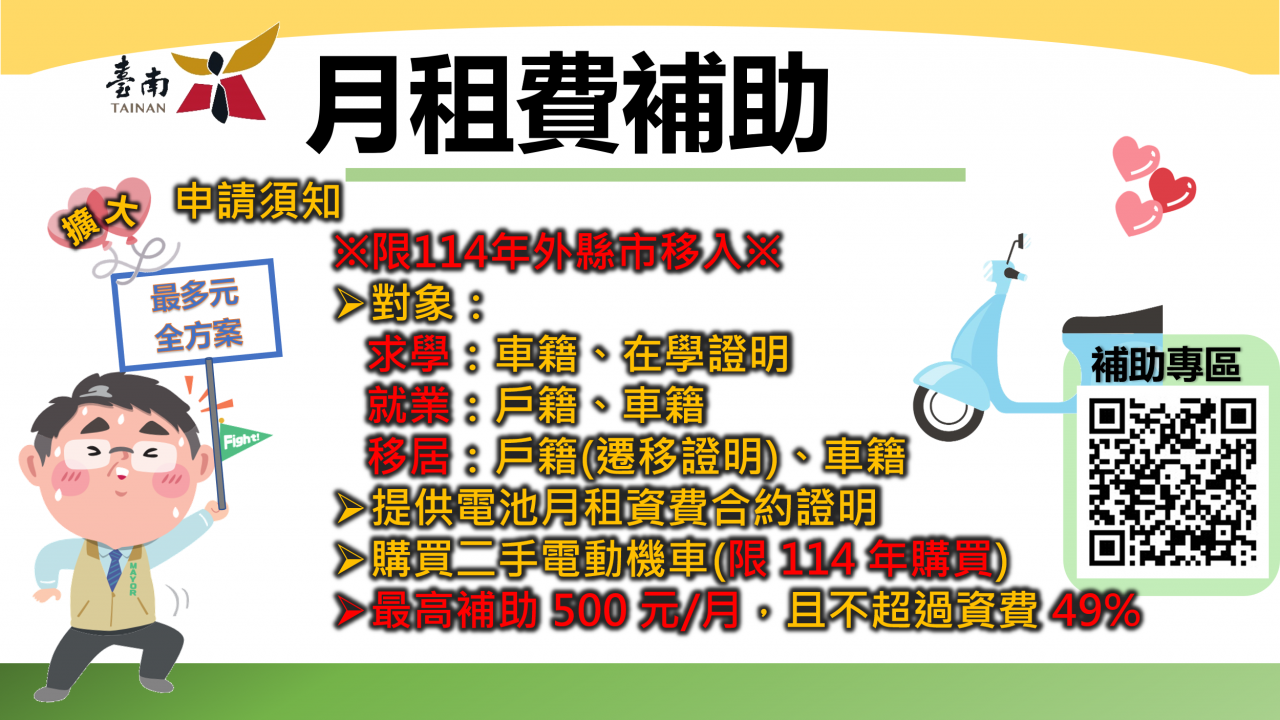(五)114 年環保局推出來臺南求學、就業、移居及市民購買二手電動機車「月租費補助」,每月最高補助 500 元,年省 6,000 元!詳情請洽環保局 06-3354359 。