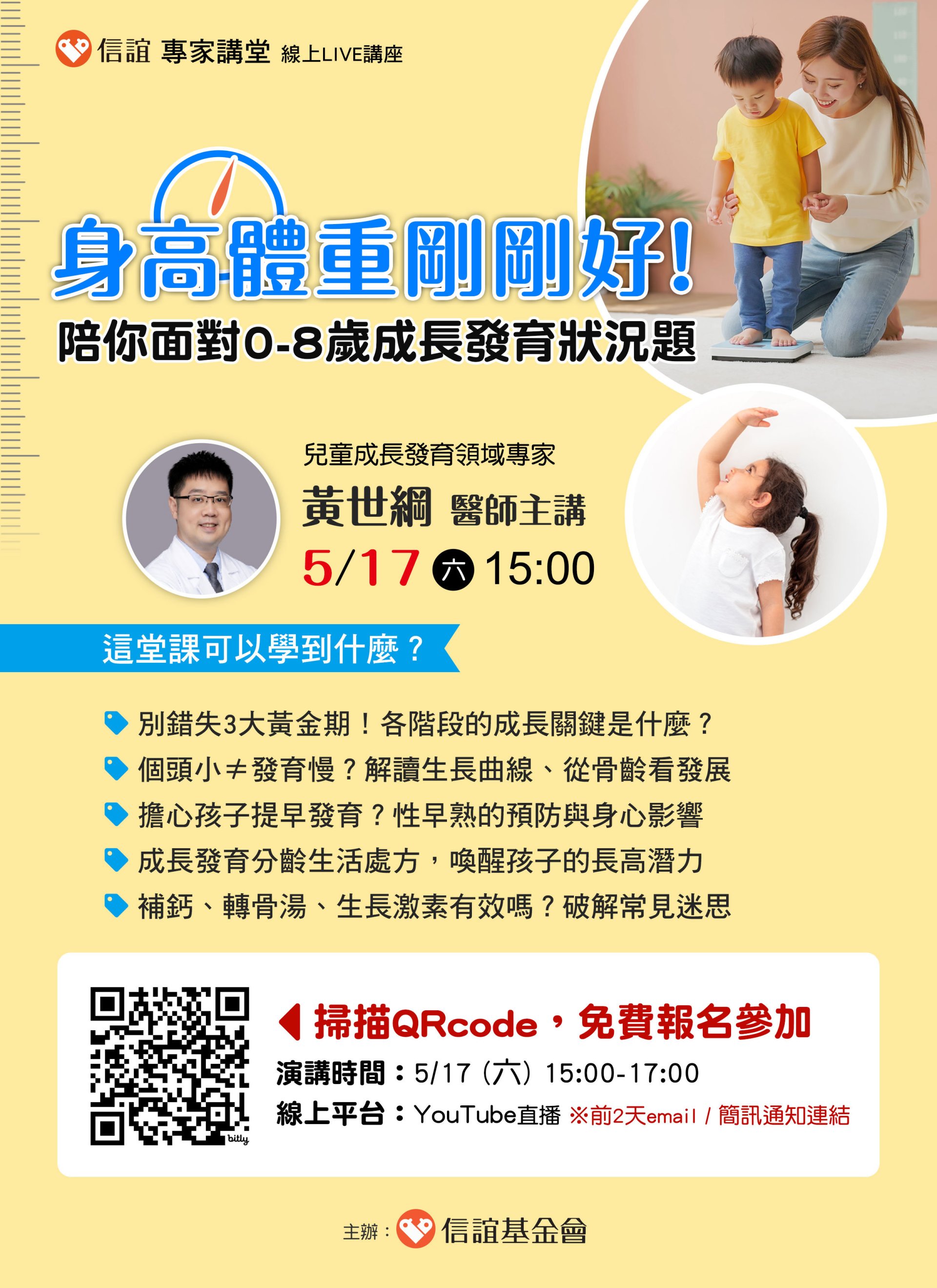 信誼基金會於5/17(六)舉辦【黃世綱醫師主講/身高體重剛剛好!陪你面對0-8歲成長發育狀況題】親職講座,