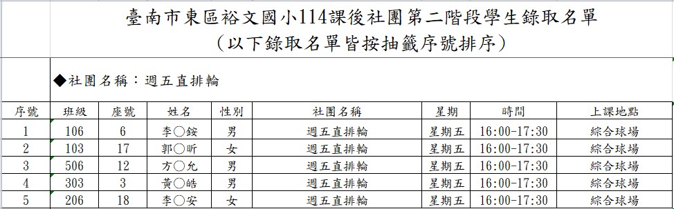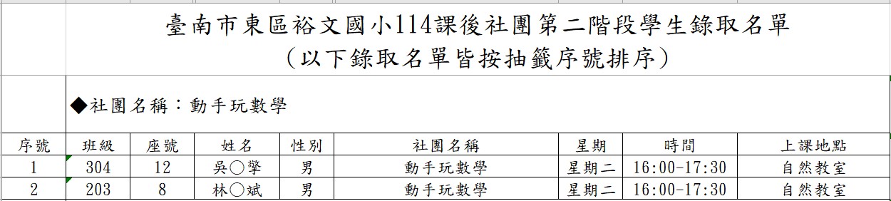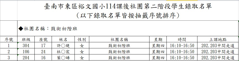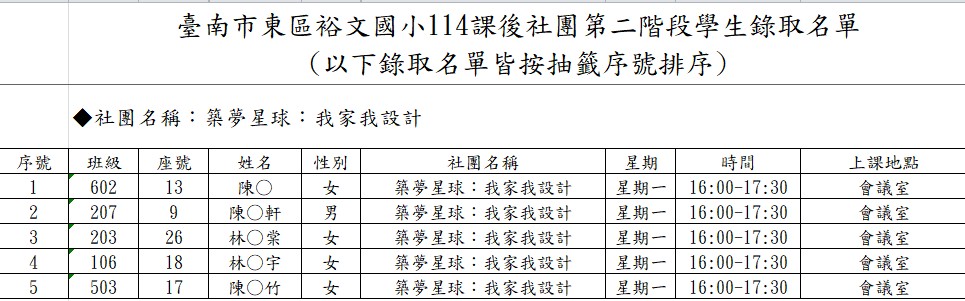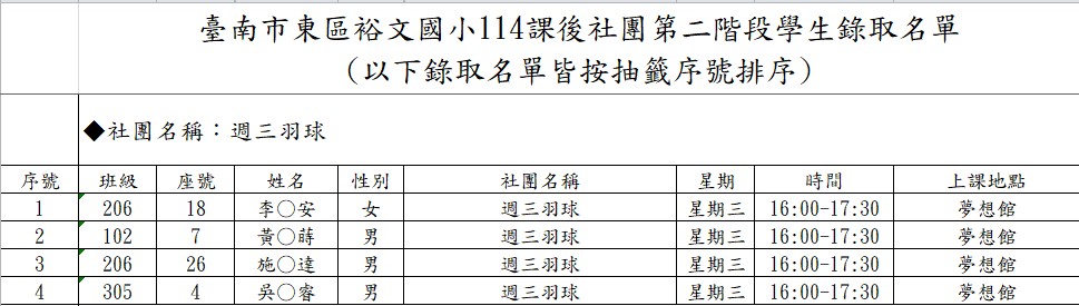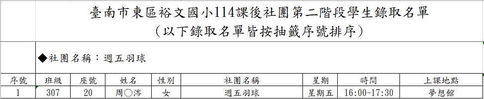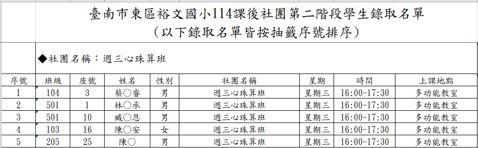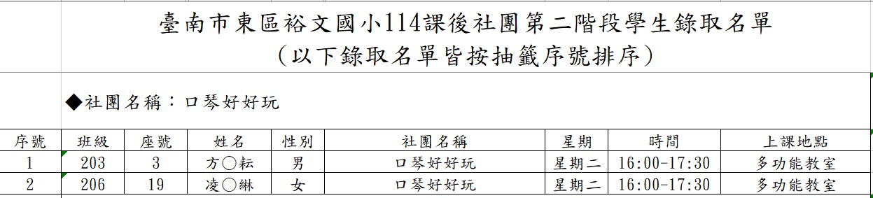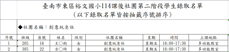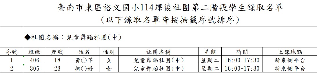 一、 114 學年度課後社團錄取名單(第二階段)如附檔。