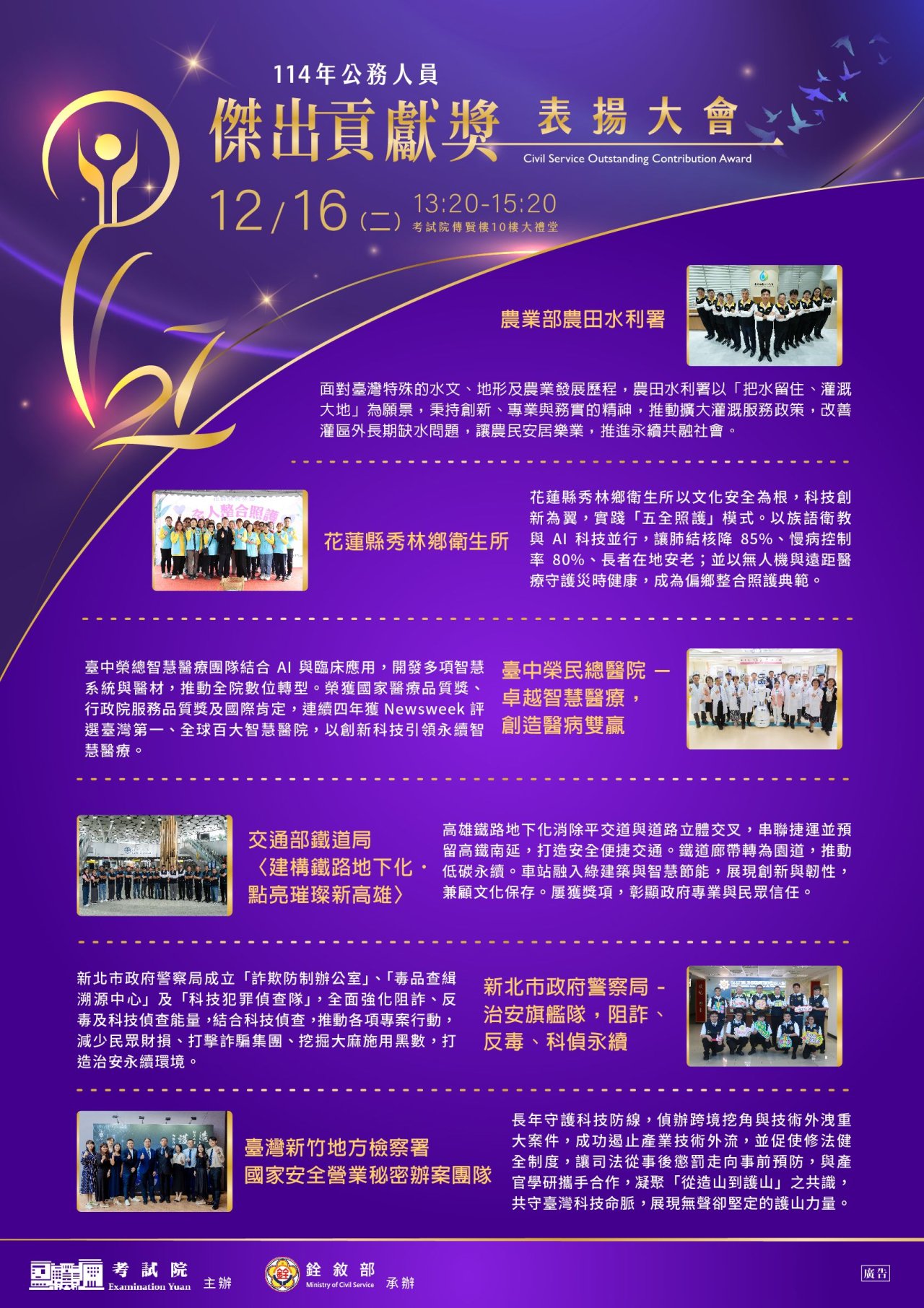 2. 本( 114 )年度公務人員傑出貢獻獎業經考試院組成評審委員會議,決議 6 名得獎人及 6 組得獎團體,茲檢附「114 年公務人員傑出貢獻獎表揚大會」個人獎及團體獎電子海報各 1 份。